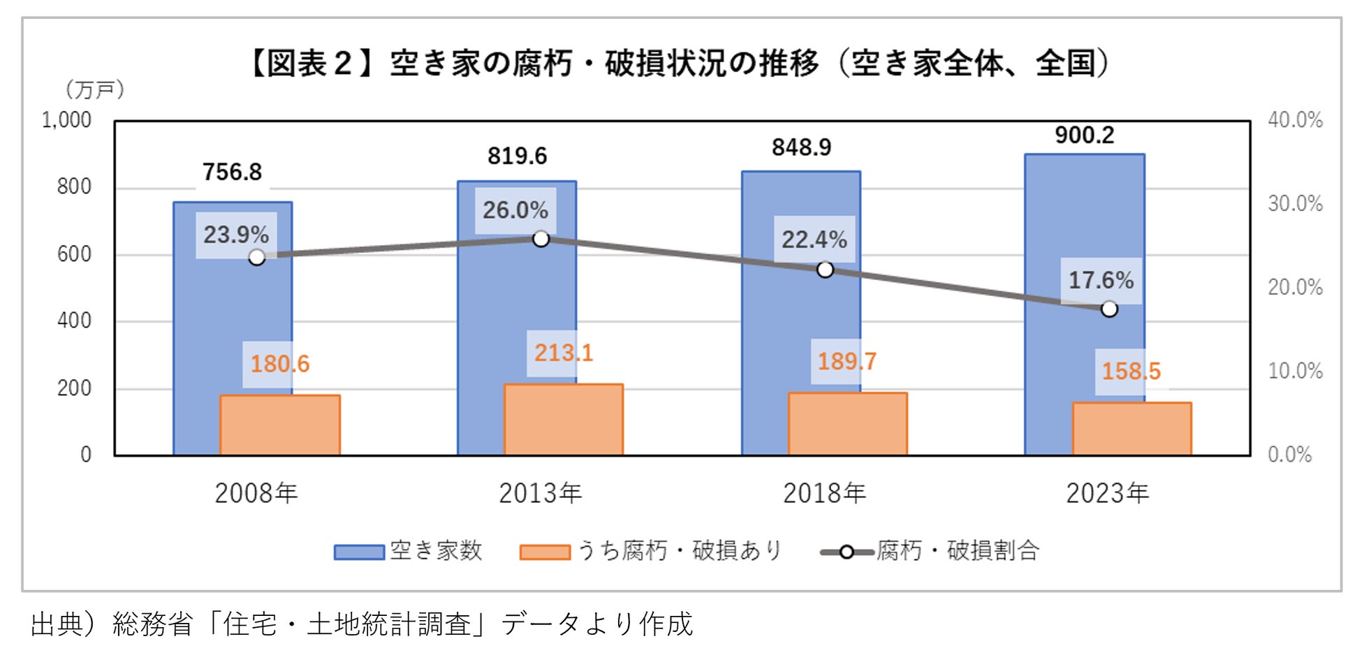 全国の空き家数は2008年(756.8万戸)から2023年(900.2万戸)で増加する一方、「腐朽・破損あり」の空き家数は、2013年の213.1万戸をピークに、2023年には158.5万戸へと減少しています。空き家の腐朽・破損割合は17.6%です。 2015年5月の「空家等対策の推進に関する特別措置法」(通称:空家法)施行で、空き家への改善指導、取り壊しなどの対策が「腐朽・破損あり」の空き家数は減少しつつあります。