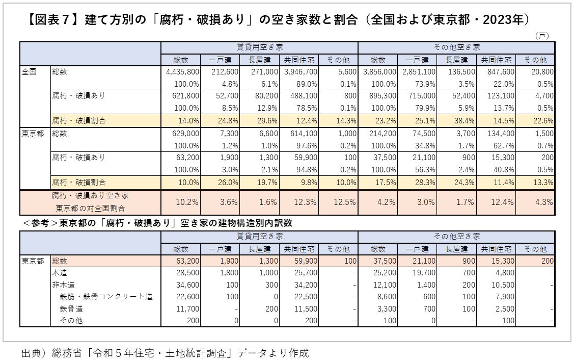 さらに、2023年の全国と東京都の空き家の状況を、建て方(一戸建、長屋建、共同住宅)別に比較してみると【図表7】、「賃貸用空き家」については、共同住宅が全国で89.0%、東京都で97.6%と圧倒的な割合を占めており、その「腐朽・破損あり」の割合はそれぞれ12.4%、9.8%と、1割程度の住宅に腐朽・破損が生じていることが分かります。東京都の「腐朽・破損あり」の共同住宅5万9,900戸について建物構造別の内訳をみると、木造2万5,700戸、鉄筋・鉄骨コンクリート造2万2,500戸、鉄骨造1万1,500戸であり、木造アパートのほか、非木造のアパート・マンション等でも腐朽・破損の問題が進行している状況がみてとれます。