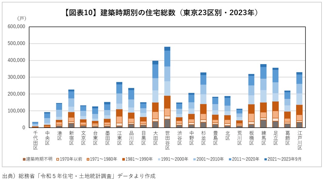 今後、東京23区別に空き家がどの程度増えていくかを、建築時期別の住宅総数【図表10】から予想すると、2040年時点で建築時期が50年以上となる住宅数(建築時期が1990年以前の住宅で建築時期不明のものも含む。取り壊し等がないと仮定)は、世田谷区で約19万戸、足立区で約15.5万戸、練馬区と大田区で約15万戸、杉並区と板橋区で約14万戸、江東区で約11万戸など、特別区全体で約200万戸に昇り、仮にその半数が空き家化すると想定した場合には世田谷区で9~10万戸、足立区、練馬区、大田区、杉並区、板橋区で7~8万戸、特別区全体で約100万戸の空き家(うち10~15万戸程度が腐朽・破損のある空き家)が生じることになります。さらにグラフからも分かるように、東京の各区(とくに区部外周部)では1991年以降も多くの住宅が供給されており、2040年以降もこれらのうち一定量が空き家として次々と積み上がっていくことが想定されます。