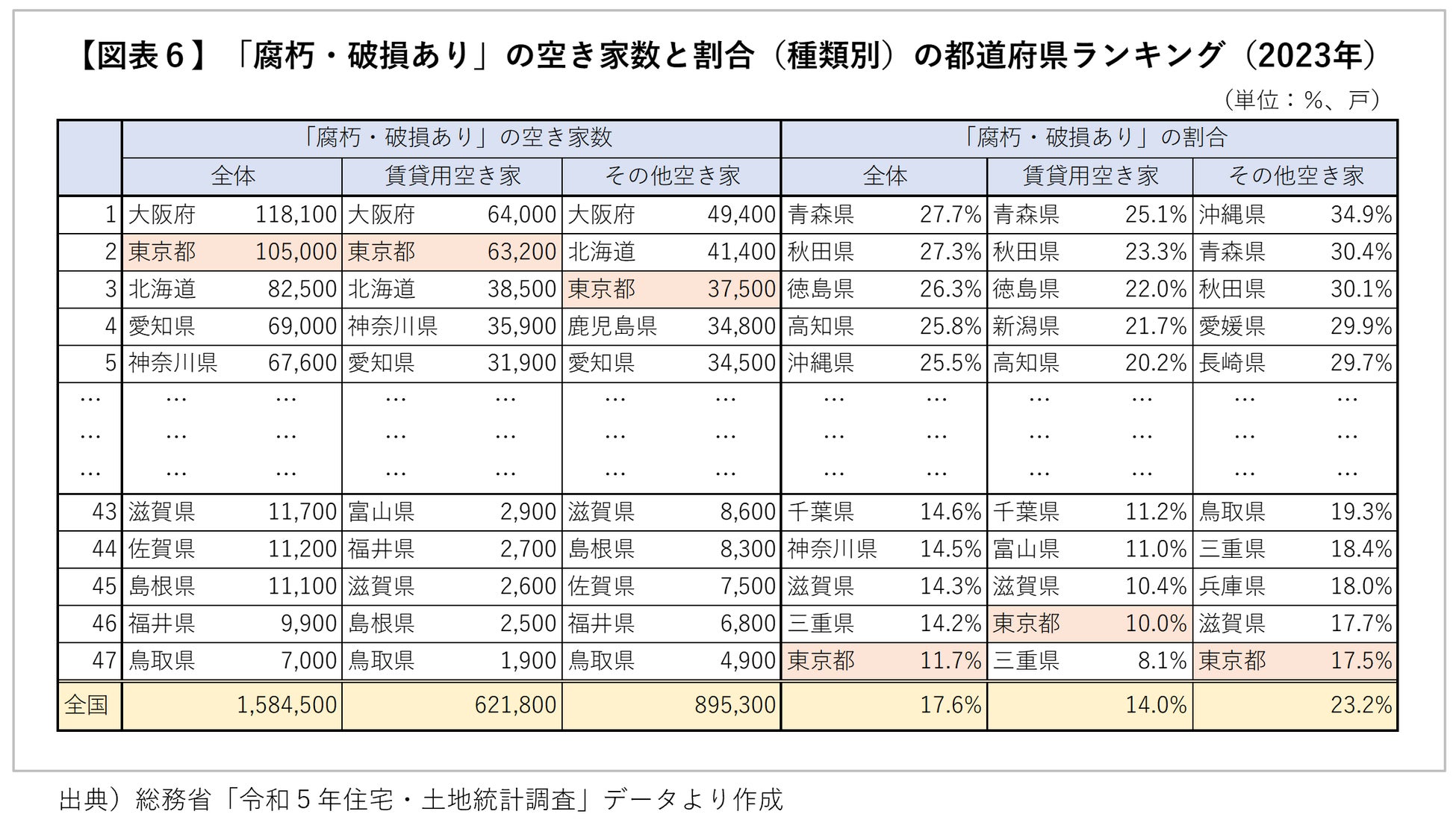 2023年の「腐朽・破損あり」の空き家数とその割合(種類別)を都道府県別にみた場合、「腐朽・破損あり」の割合ランキングで東京都は「賃貸用空き家」「その他空き家」のいずれもほぼ最下位に位置していますが、「腐朽・破損あり」の空き家数でみれば、東京都は全体で2位、「賃貸用空き家」で2位、「その他空き家」で3位であり、やはりその実数は極めて多いことが分かります【図表6】。