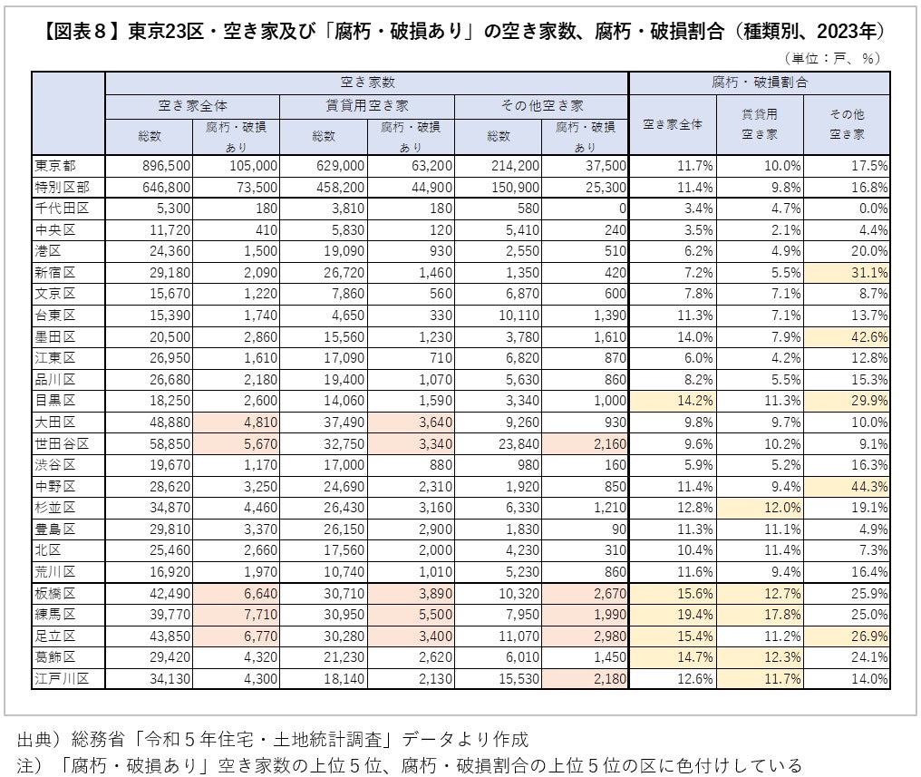 次に、東京23区別に2023年の「腐朽・破損あり」の空き家の状況についてみていきます【図表8、図表9-1~9-3】。