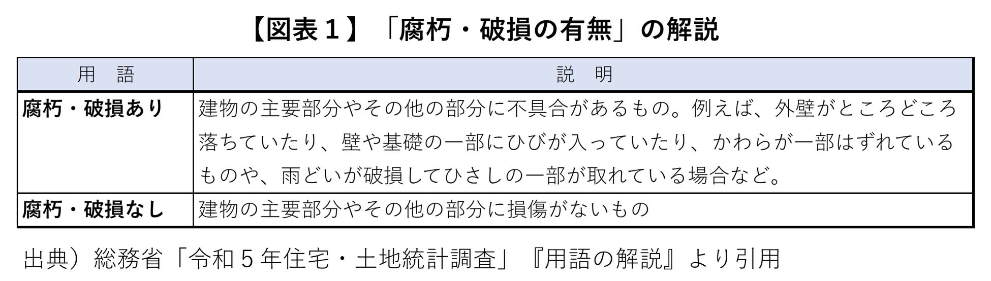 そこで、総務省「住宅・土地統計調査」では、2008年から、空き家のうち「腐朽・破損あり」の住宅数についても調査・公表されるようになっています(「住宅・土地統計調査」における「腐朽・破損あり」の説明は【図表1】のとおり)。