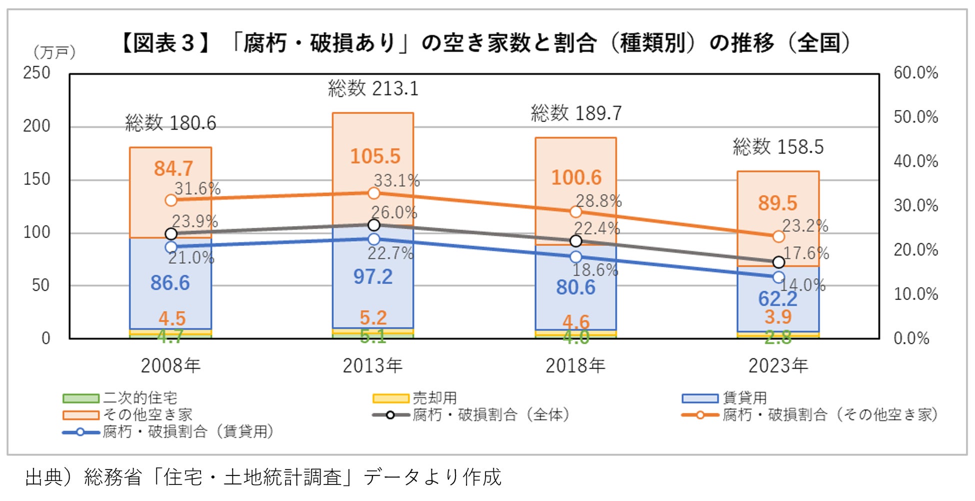 この「腐朽・破損あり」の空き家数を種類別にみると【図表3】、2023年の総数158.5万戸のうち、「賃貸用空き家」は62.2万戸、「その他空き家」は89.5万戸であり、「その他空き家」の方が上回っています。「腐朽・破損あり」の割合も、「賃貸用空き家」(14.0%)より「その他空き家」(23.2%)の方が大きく上回り、「その他空き家」ではおおよそ4戸のうち1戸に腐朽・破損がある状況がみてとれます。