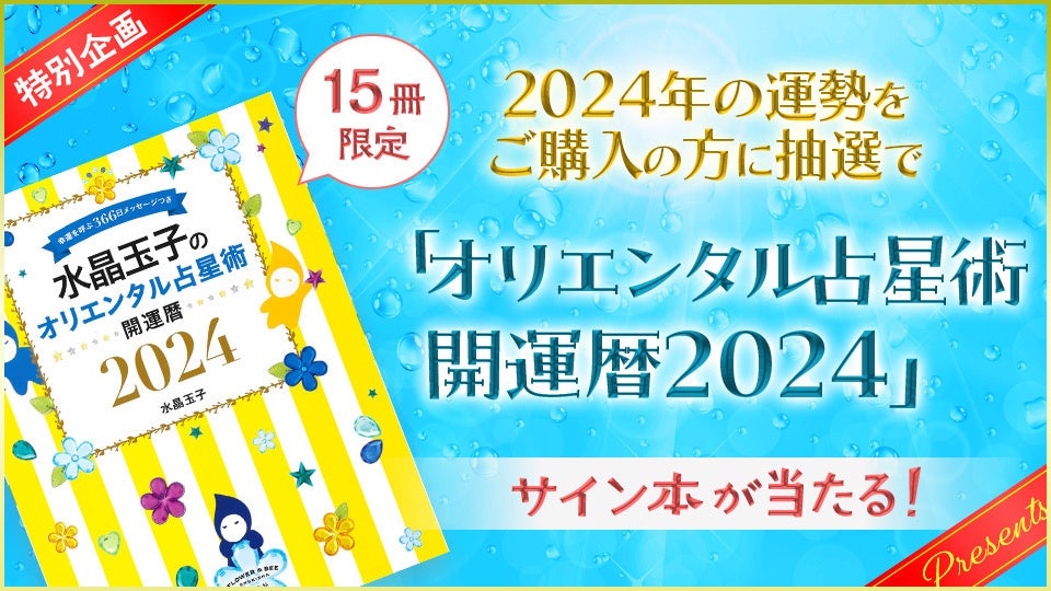 公式占いサイトにて、占い福袋をご購入の方を対象に、水晶玉子直筆開運メッセージ付き書籍が抽選で当たるプレゼントキャンペーンを実施いたします。水晶玉子さんの直筆開運メッセージ入り『水晶玉子のオリエンタル占星術 幸運を呼ぶ365日メッセージつき 開運暦2024』を抽選で15名様にプレゼントいたします。