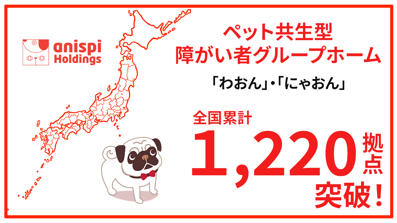 ペット共生型障がい者グループホーム「わおん」「にゃおん」を展開する株式会社アニスピホールディングス(東京都千代田区、代表取締役:藤田英明、以下「当社」)は、2023年2月1日付けで新たな事業所が21拠点オープン(全国累計1,220拠点)いたしましたのでお知らせします。
