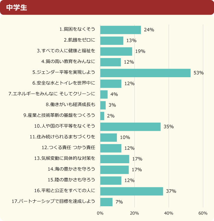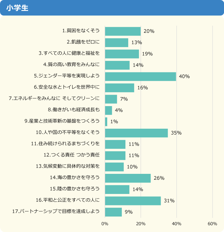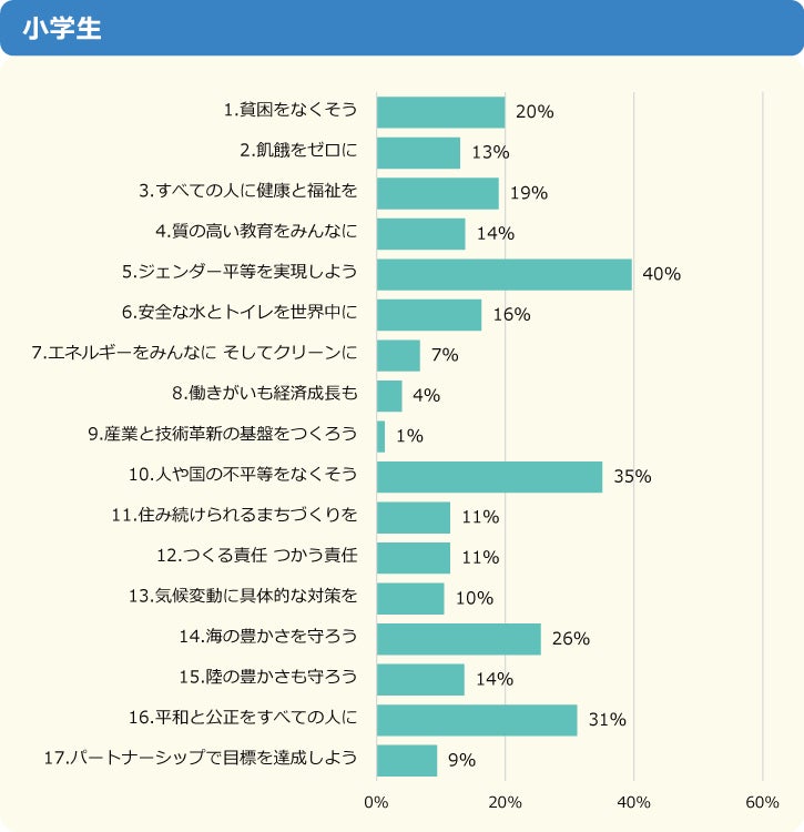 「ジェンダー平等を実現しよう」については、「自分自身がトランスジェンダーだから」「私の友だちで悩んでいる子がいるから」などの意見がありました。その他の目標にも、子どもたちが自分自身の実体験をもとにした回答が多く寄せられました。