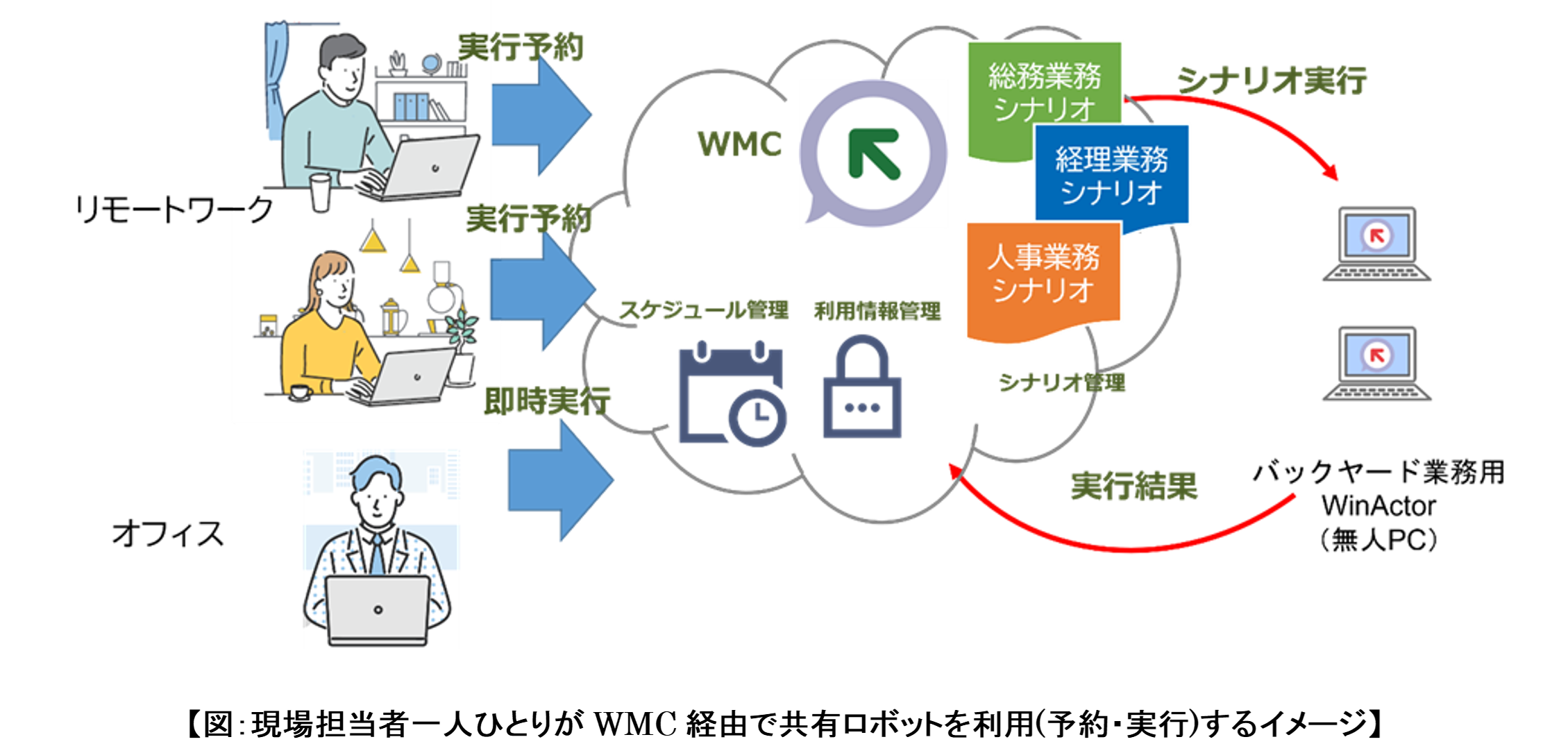 WinActorの管理サービスであるWMCVer.3.6は、情シス部門による全社のWinActorを統括する頑健な管理運用下においても、現場担当者によるシナリオ実行利用が可能となり、多様な運用を容易に実現します。また、管理運用下と現場における実行利用の両方向からの利用により、ロボットの有効利用による稼働率の向上や、現場担当者が操作した証跡の記録が可能になり、運用コストを押さえながら担当一人ひとりがロボットを利用できる安全な運用を実現します。