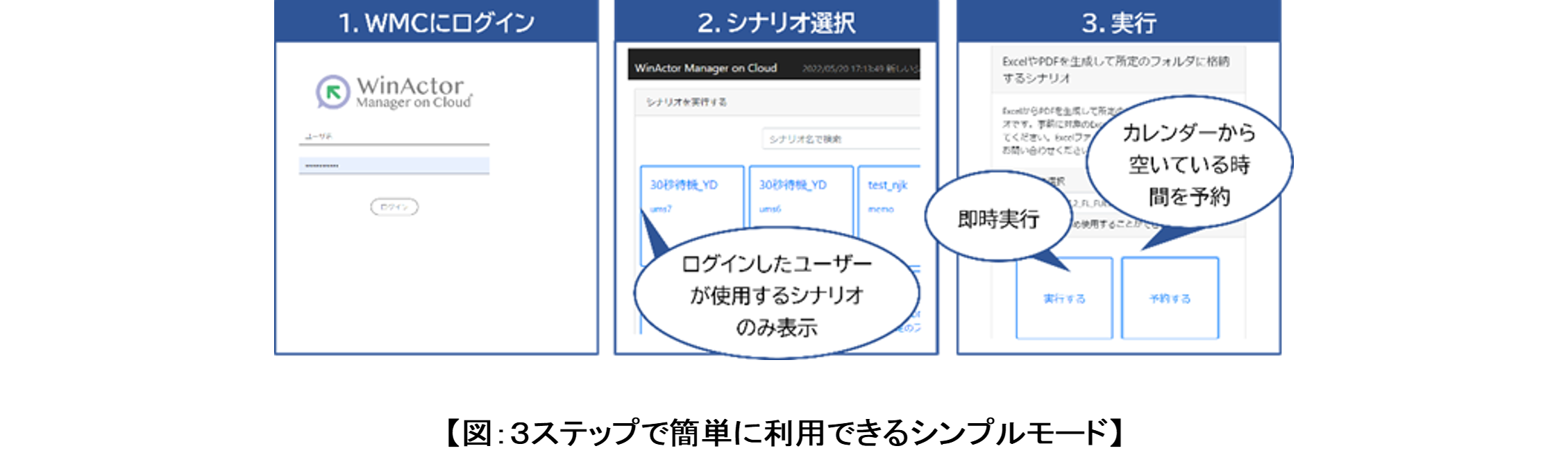 ユーザーが利用することに特化した簡易型UIを追加し、WinActorやシナリオの管理を行う管理者向けの既存UIとの使い分けを実現しました。全社規模でのRPA利用が促進可能です。