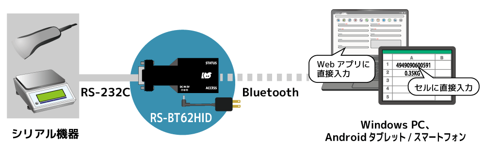 RS-BT62HIDをRS-232C機器に装着し、機器から出力されるデータを端末にBluetoothで転送。RS-232Cポートを持たないWindows PCやAndoidタブレットに、キーボードイベントとして取り込みがおこなえます。受信データはExcelシートのセルやテキストエディタ、Webアプリに直接文字として入力されます。