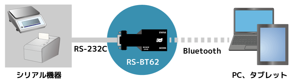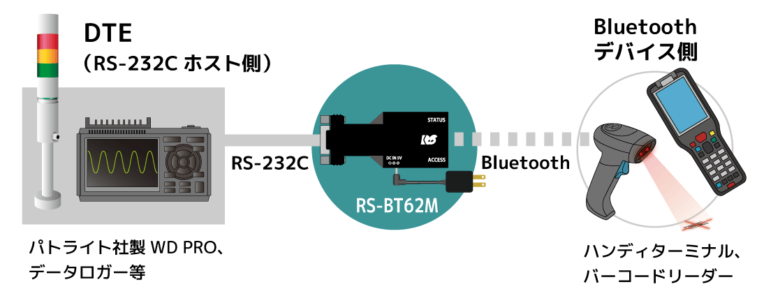 既存のRS-232Cシステムに変更を加えることなく、Bluetooth経由の無線システムに置き換えることができるモデルです。DTE側変換アダプター(RS-BT62M)とDCE側変換アダプター(RS-BT62)のセットで、DTEとDCE双方のシリアルポートに本製品を接続します。