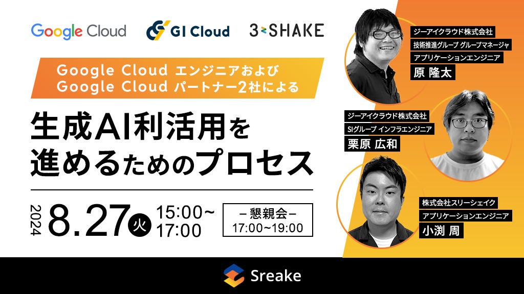 株式会社スリーシェイク(本社:東京都新宿区、代表取締役社長:吉田 拓真、以下スリーシェイク)は、2024年8月27日(火)にグーグル・クラウド・ジャパン合同会社、およびジーアイクラウド株式会社と共同で、生成AI利活用の最新情報やプロセスについてご紹介する無料のセミナーを開催します。