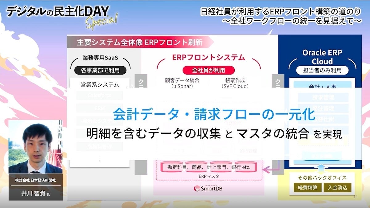 続いては株式会社日本経済新聞社 コーポレート基盤ユニット 井川氏による、クラウドの会計システム周辺業務でのSmartDB(R)活用事例についての講演です。 財務会計業務のうち債務管理と債権管理を題材にERPフロントシステムを構築する際のポイントをご紹介いただいたほか、全社ワークフローの統一という今後の展望についても語っていただきました。