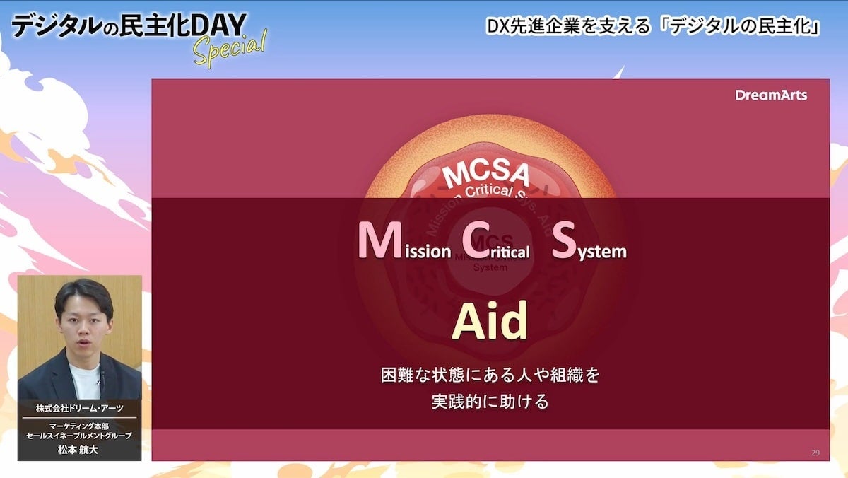 オープニングはドリーム・アーツ マーケティング本部の松本よりお話ししました。 IT人材不足をはじめ多くの大企業が抱えるDX・業務デジタル化の課題を背景に、イベントタイトルにもある「デジタルの民主化」という考え方をご紹介。 また、基幹システム周辺の複雑な業務のデジタル化を支援する「MCSA(Mission Critical System Aid)※2」のコンセプトについてもお伝えしました。