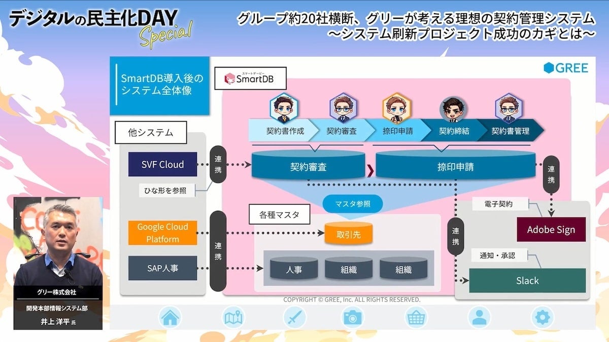 続いて最初のユーザー講演は、グリー株式会社 開発本部 情報システム部の井上氏からです。 同社では約20のグループ会社が関わる契約管理業務をSmartDB(R)を中心としたSaaS連携で構築しています。 紆余曲折があったシステム刷新プロジェクトの経験をもとに、プロジェクト成功のポイントや理想とするシステム構築についてお話しいただきました。