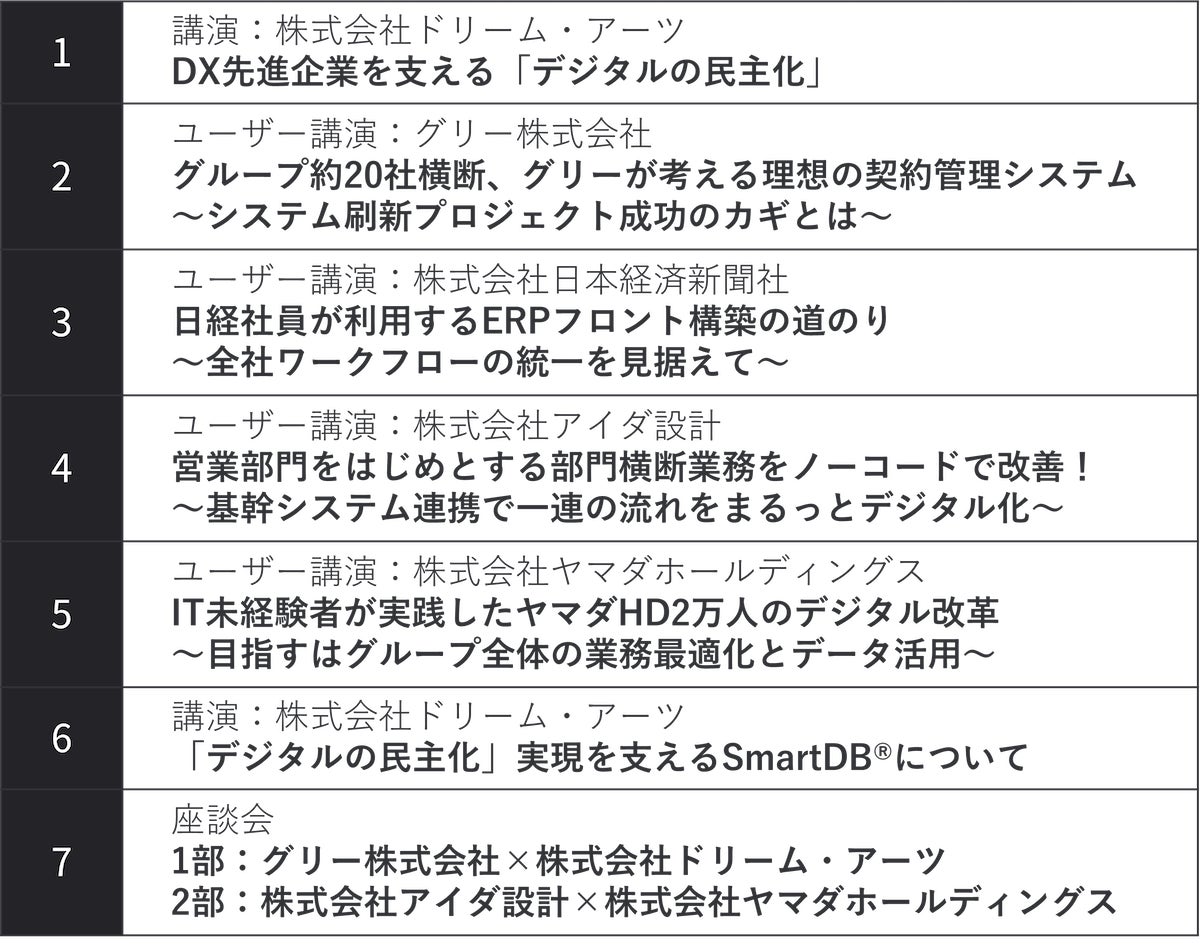 当日は主催のドリーム・アーツのほか、業務デジタル化クラウド「SmartDB(R)(スマートデービー)」のユーザー企業4社による講演と座談会をお届けしました。