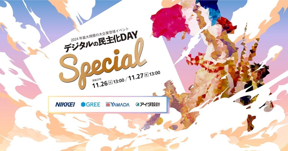 大企業向けクラウドサービスの株式会社ドリーム・アーツ(東京本社:東京都渋谷区、広島本社:広島県広島市、代表取締役社長:山本 孝昭、以下 ドリーム・アーツ)は、2024年11月26日(火)と27日(水)に、「デジタルの民主化DAY -Special-」を開催し、その内容についてレポートを公開しましたのでお知らせします。 当日は、DXに取り組む大企業として株式会社日本経済新聞社、グリー株式会社(現 グリーホールディングス株式会社)、株式会社ヤマダホールディングス、株式会社アイダ設計の4社が登壇しました。 本イベントは1,945名からの申し込みがあり、アンケートによる満足度は98%以上と好評。 大企業のDXや業務デジタル化に対する関心の高さを示す結果となりました。
