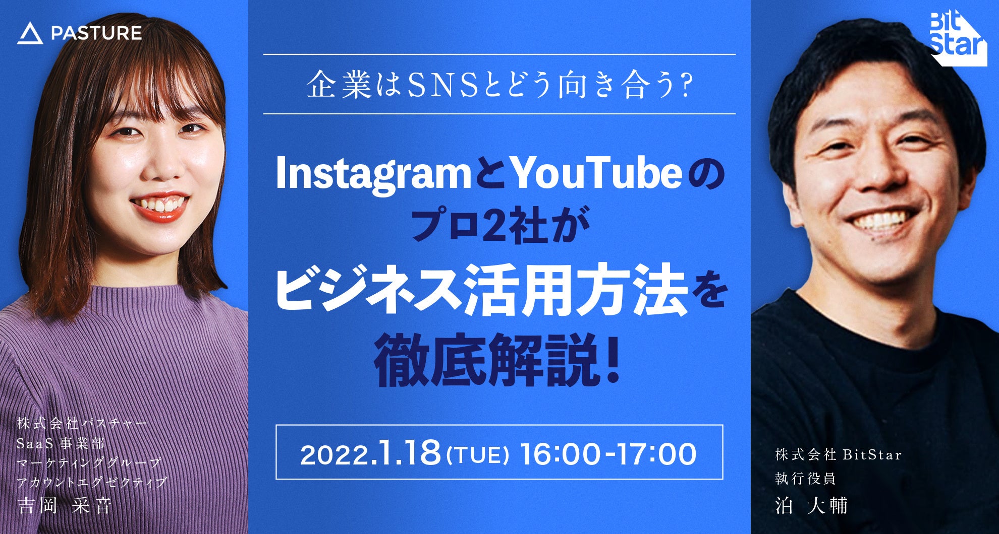Instagramを中心にSNSマーケティング支援を行う株式会社パスチャー(本社:東京都渋谷区、代表取締役:甲斐 優理子、以下当社)は、企業YouTubeチャンネルの制作・運営を多数サポートする株式会社BitStar(本社:東京都渋谷区、代表取締役 社長執行役員CEO:渡邉拓)と共同で、2022年1月18日(火)16時〜17時に無料セミナー「企業はSNSとどう向き合う?InstagramとYouTubeのプロ2社がビジネス活用方法を徹底解説!」を開催いたします。