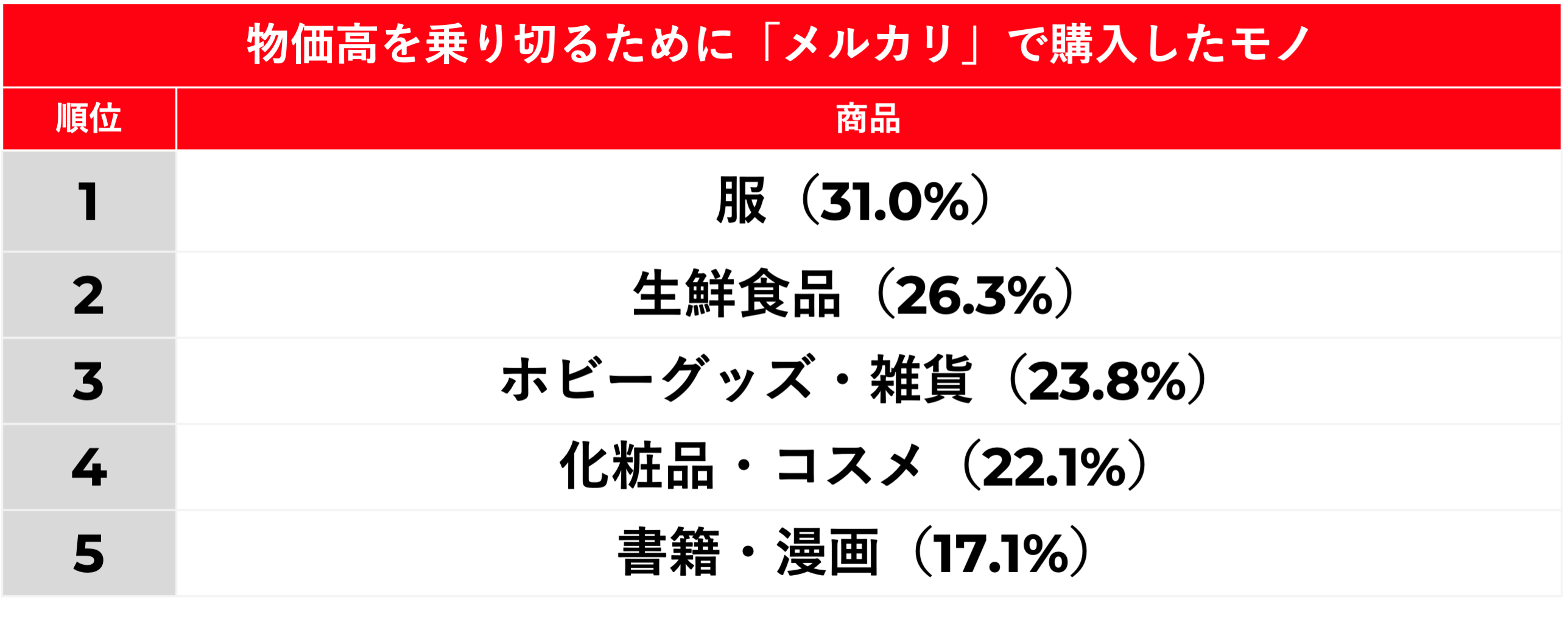 - 1. メルカリ利用者の約96%は物価上昇の影響を受けており、物価高を乗り切るために「メルカリ」でおトクに購入したモノランキング