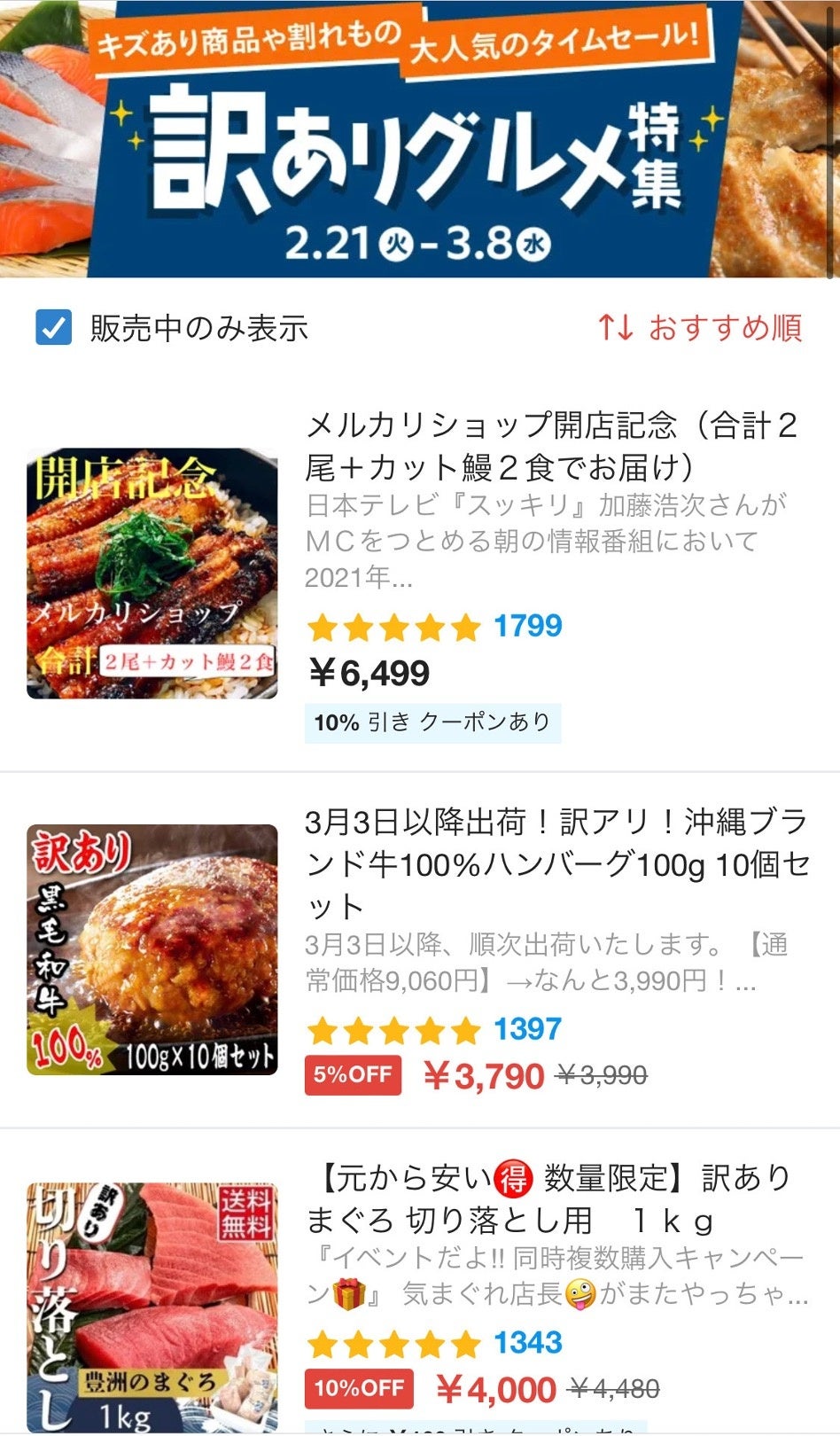 商品:形が不揃い、切り落とし部位など美味しさはそのままだけど、おトクに購入できる商品が並びます