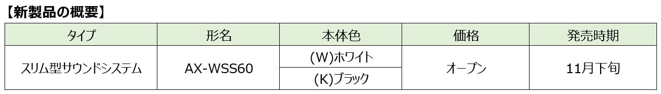 東芝エルイートレーディング株式会社[※1]は、オーディオブランド「AUREX(オーレックス)」シリーズより、スリム型サウンドシステム「AX-WSS60」を11月下旬より発売します。