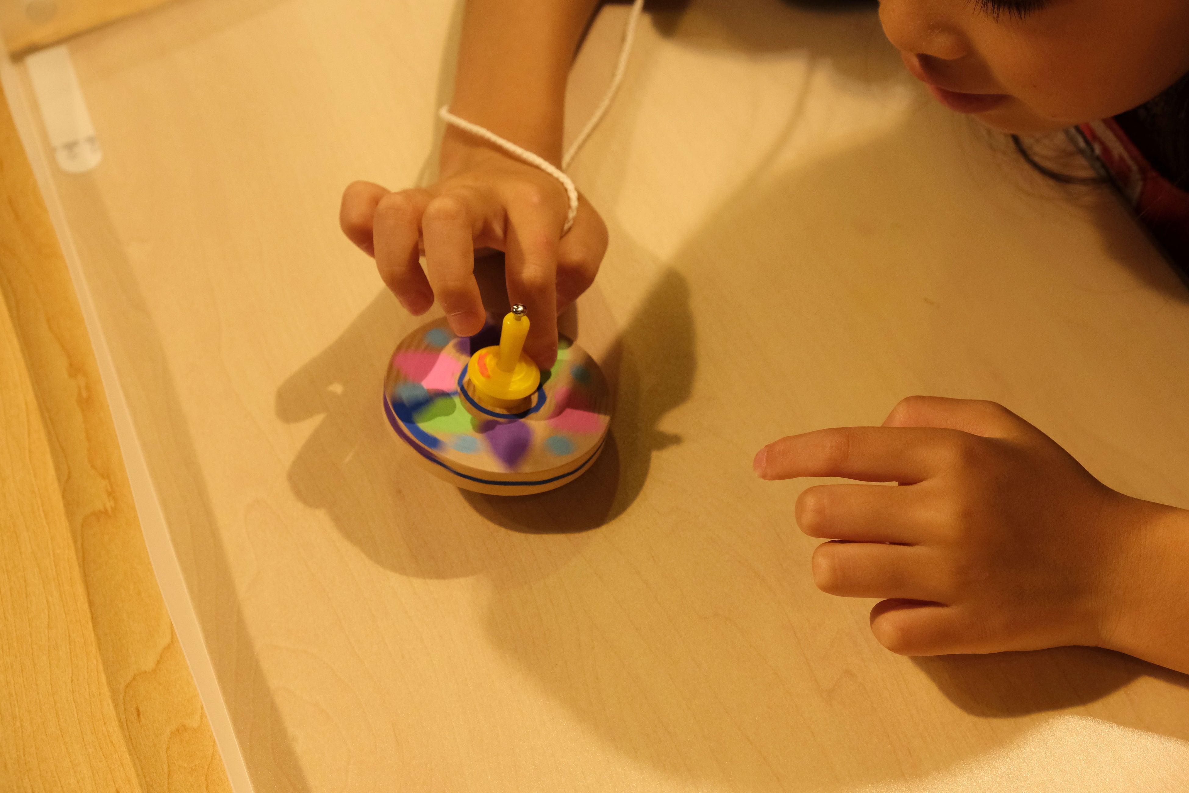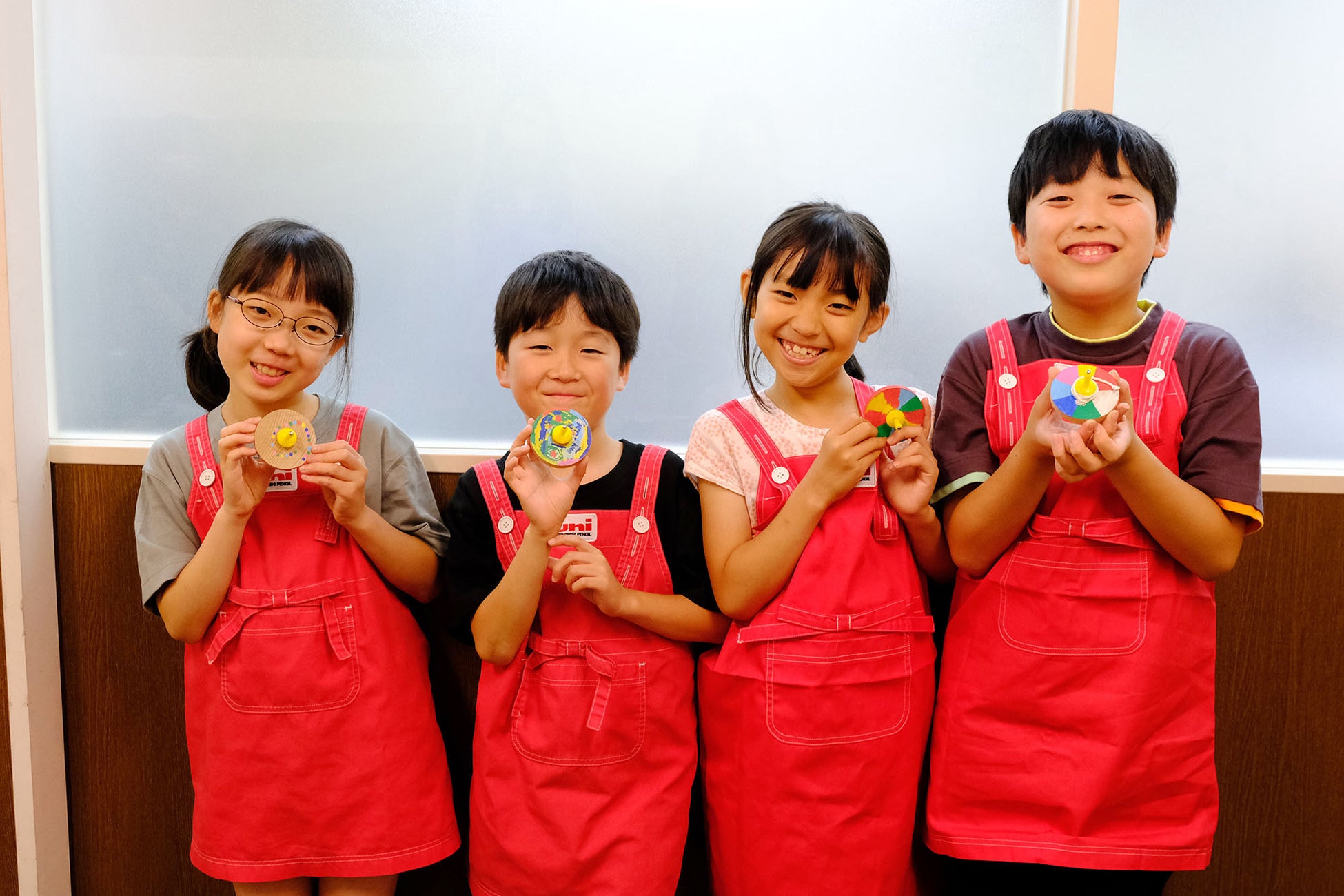 参加したお子様方は、古くから親しまれているおもちゃの一つであるコマについて学びながら、ペインティングの面白さや回転時の色の変化などを楽しんでいました。