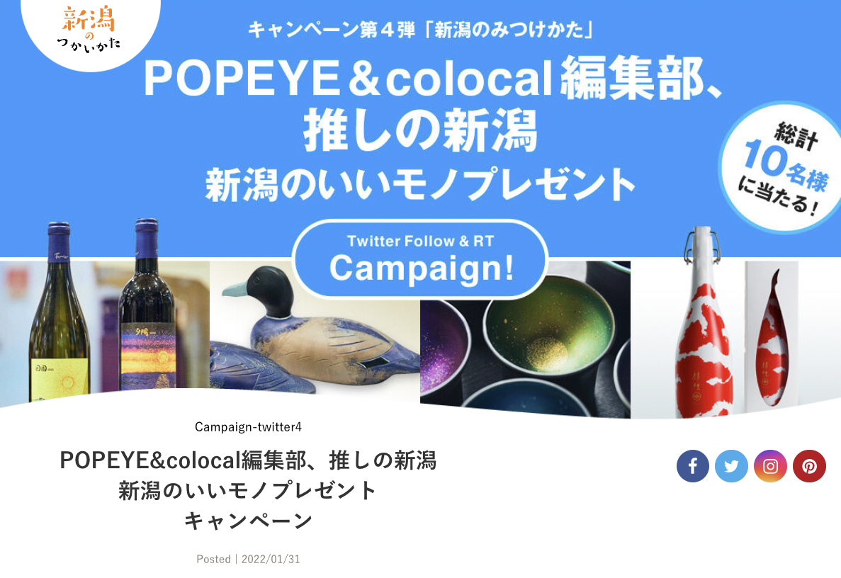 株式会社マガジンハウス(本社:東京都中央区、代表取締役社長:片桐隆雄)は、新潟県とマガジンハウスのコラボレーションで制作・運営されているポータルサイト『新潟のつかいかた』が行うUIターン促進キャンペーン企画の一環として、『POPEYE & colocal編集部が見つけた「新潟のいいモノ」をプレゼント!』を2月14日から実施します。