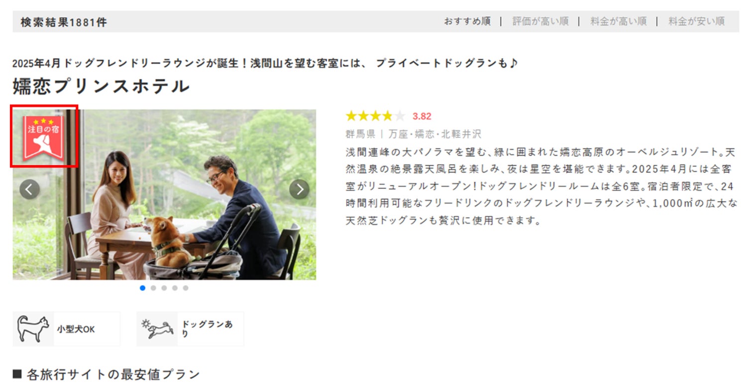 一定の条件を満たした施設様には、2週間の上位表示オプション広告を無料でご提供いたします。「注目の宿」バッジの付与に加え、施設が設定されている小エリア内で上位2枠以内に表示させることができます。これにより、より多くのユーザーにリーチできるため、8-9月に向けた予約増加が期待できます。