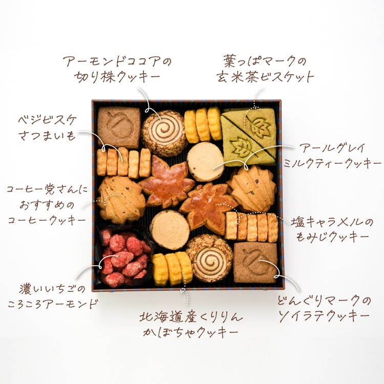 「コーヒーやソイラテ、ミルクティーに玄米茶など...秋らしい飲みもの風味のクッキーがぎっしり。秋の味覚であるさつまいもとかぼちゃのクッキーも入れました。お茶の時間にひとつずつつまんでお楽しみください。缶のデザインにもある、白いお皿のクッキー3種も探してみてください。」