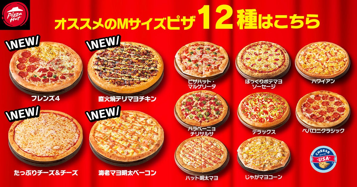 ※対象ピザ:「ピザハット・マルゲリータ」「ペパロニクラシック」「ハット明太マヨ」「ハラペーニョチリサルサ」「完熟トマトのチーズ&チーズ」「デラックス」「ほっくりポテマヨソーセージ」「ハワイアン」「フレンズ4」「直火焼 テリマヨチキン」「たっぷりチーズ&チーズ」「海老マヨ明太ベーコン」