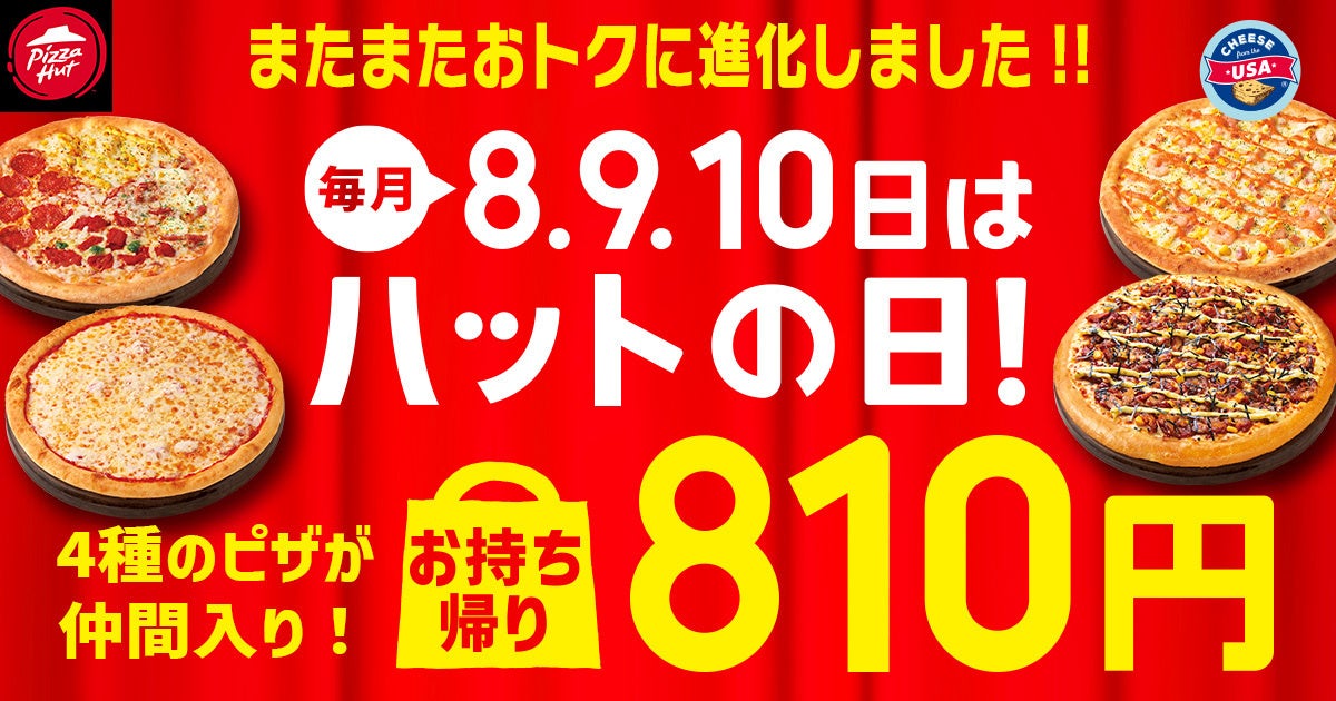 対象ピザ(Mサイズ・お持ち帰り限定)が一律810円で食べられるピザハットの毎月恒例イベント「ハットの日」が、過去最高クラスにおトクな割引額になって、またまた進化いたしました!