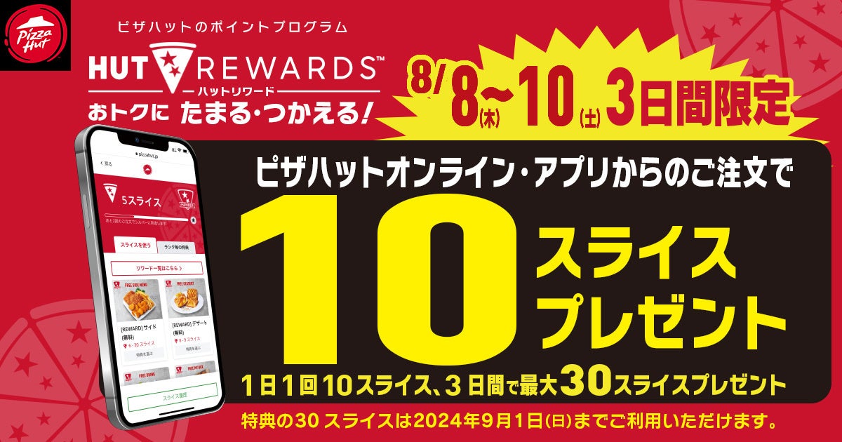 2024年8月8日(木)〜8月10日(土)の「ハットの日」期間中は、ピザハットのメンバーシッププログラム「HUT REWARDS(ハットリワード)」でのポイントである「スライス」を会員様へ10スライスプレゼント。