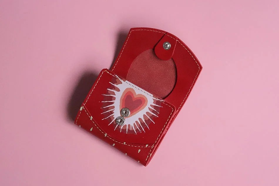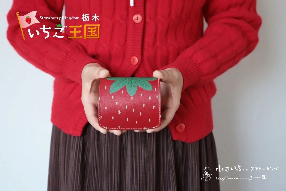 栃木の名産いちご「とちあいか」をモチーフにした、いちご好きのためのお財布です。縦に切るとハート型の断面が現れる「とちあいか」をデザインに取り入れ、中のポケットにも可愛らしいいちごのモチーフをあしらいました。三つ折りペケーニョより、ワンサイズ大きいので収納力がアップしました。