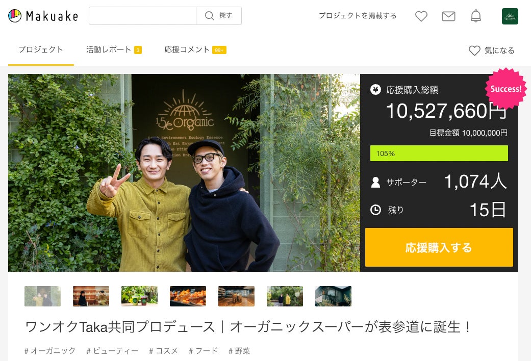 「ONE OK ROCK」のTakaと共同プロデュースしたオーガニックスーパー「15/e organic」が、Makuakeにて開始3日でオーガニック関連プロジェクトのレコードを更新!