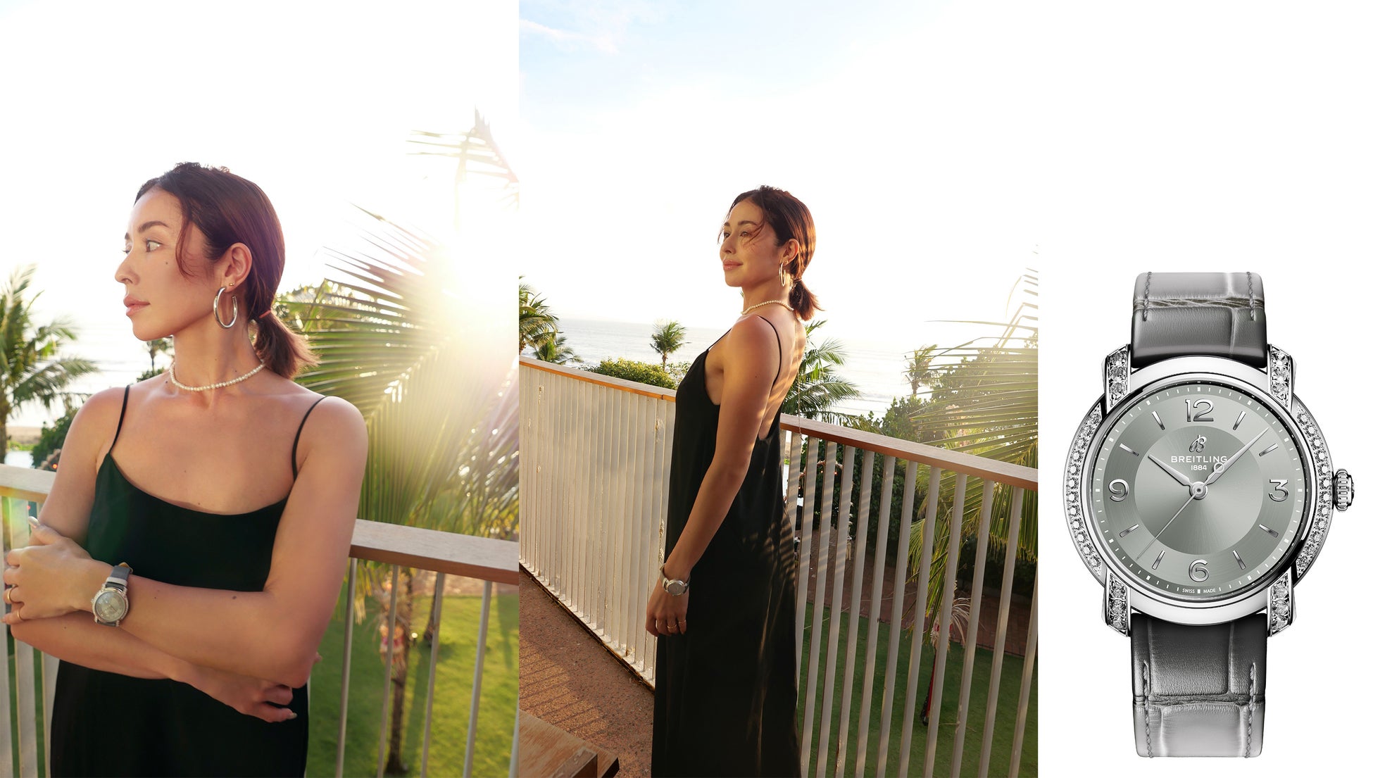 リゾートでの夕暮れ。ディナーへと向かうモノトーンのドレスに、ニュートラルなダブグレーダイヤルを合わせ、静かに個性を引き立てます。グラデーション仕上げのストラップと、奥行きを感じるダイヤルが、彼女らしい遊び心とエレガンスを演出。