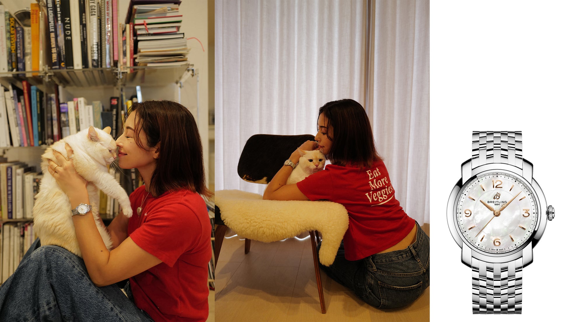 やわらかな光を受けて表情を変えるダイヤルが、穏やかな午後のひとときに上品な輝きを添えます。愛猫とのリラックスした時間にも、彼女らしいエレガンスが静かに息づいて。