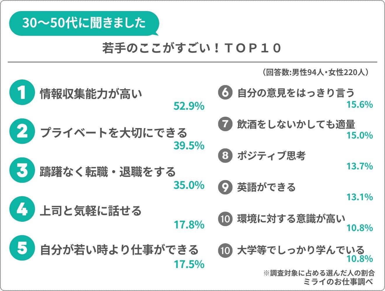 1位は「情報収集能力が高い」で、半数以上の52.9%が若手のすごさとして挙げました。