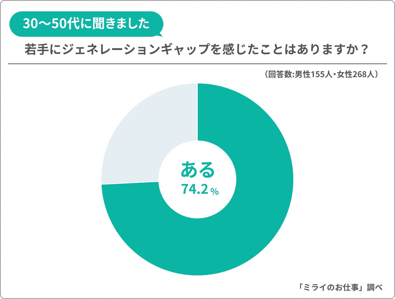 まずは社会人経験がある30歳以上の男女423人に、職場の若手に対してジェネレーションギャップを感じた経験があるか聞いてみました。