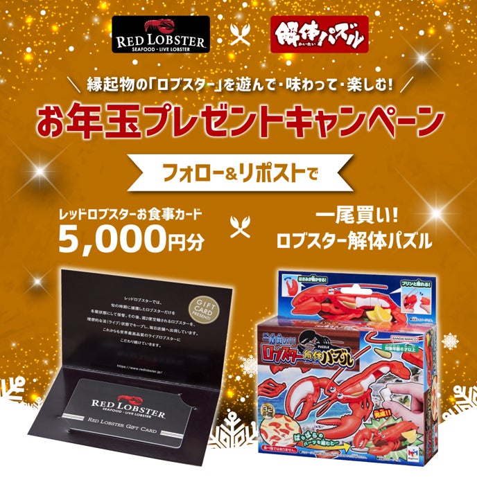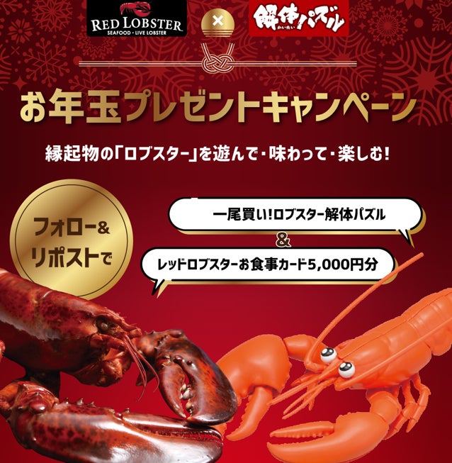 アメリカ発祥のシーフードレストラン「レッドロブスター」を運営するレッドロブスタージャパン株式会社(本社:東京都渋谷区 代表取締役:大塚啓 以下:レッドロブスタージャパン)は株式会社メガハウス(バンダイナムコグループ 本社:東京都台東区 代表取締役社長:佐藤明宏 以下:メガハウス)と、レッドロブスター全店でお使い頂ける「レッドロブスターギフトカード5,000円分」とメガハウスの「一尾買い!!ロブスター解体パズル」が抽選であたる「遊んで・味わって・楽しむ!Wロブスターお年玉プレゼント」キャンペーンを2024年12月25日(水)~1月8日(水)まで開催いたします。