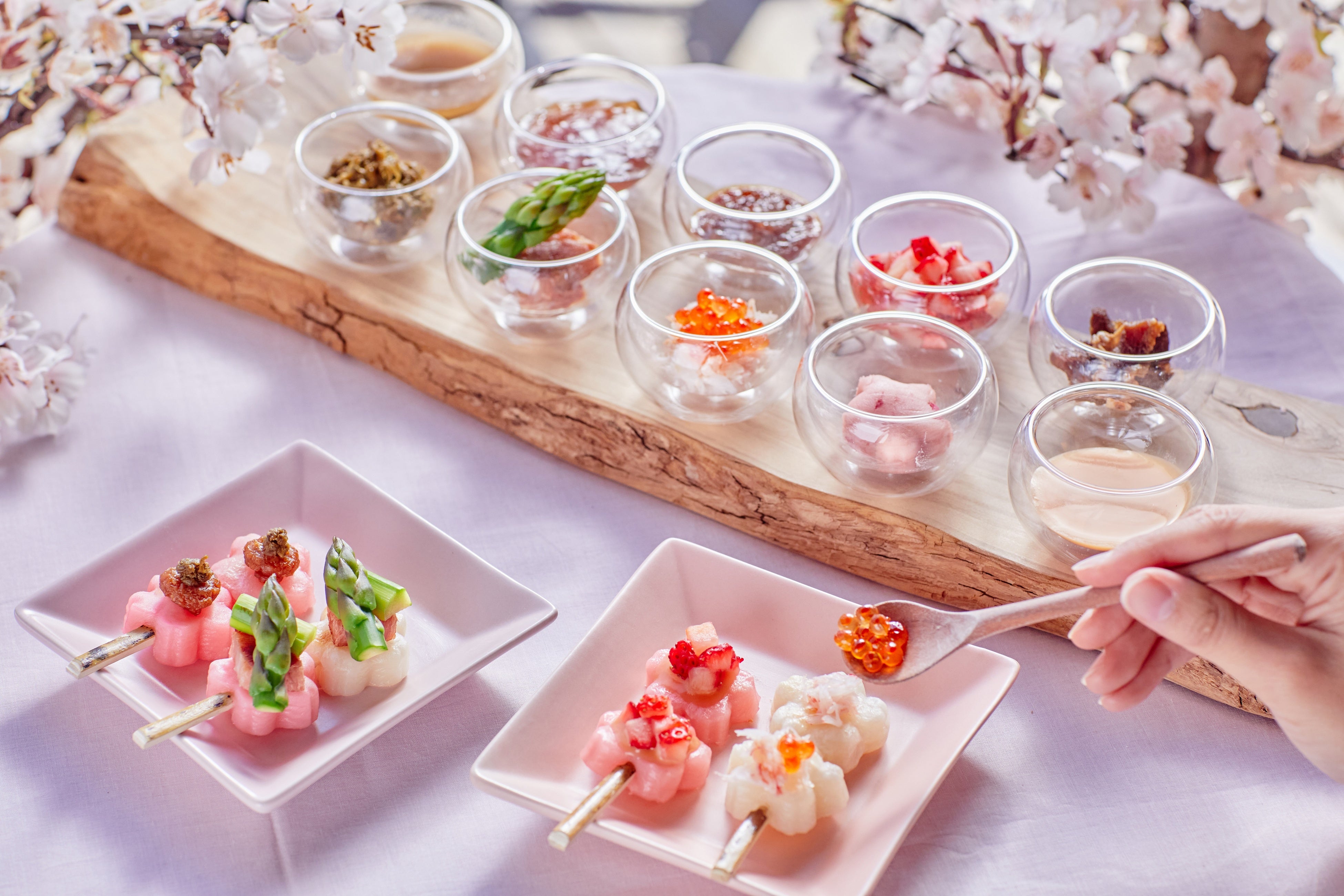 桜型をしたお花見団子に、みたらしやいちごなど王道のスイーツ系のものから、バター醤油、蟹いくらなどのお食事系のものまで合計10種類のトッピングを組み合わせて、さまざまな味を楽しめます。トッピングには、他にもトマム牛乳(*2)を使用したミルクジャムや、北海道のお花見の定番であるジンギスカンを用意。北海道ならではのものから春の味覚のものまで、自分好みの組み合わせを見つけて、お花見団子を楽しめます。