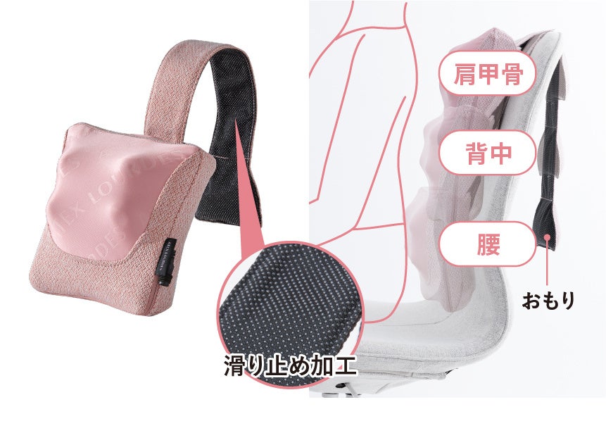 マッサージクッションをソファや椅子に置く際に、もみ玉の位置をもみたい部位に調整するためのベルトが付いています。ベルトがあることで、もみ玉が肩甲骨の間にぴったりフィット。ベルト(おもり付)は滑り止め加工していますので好きな位置で止まります。