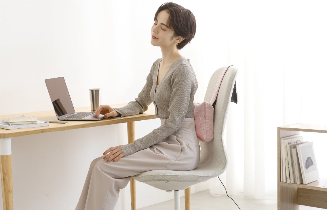 2009年のマッサージクッション発売以来、最小・最軽量のマッサージクッションだから実現した、椅子に座りながらの肩甲骨へアプローチ。肩甲骨の間にもみ玉をしっかり当て、指をゆらすような動きでコリや疲れをほぐします。