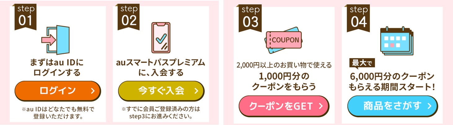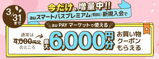期間中に、キャンペーンページよりau IDでログインいただき、auスマートパスプレミアム(有料)に新規入会いただくと最大6,000円分割引クーポンをプレゼントします。