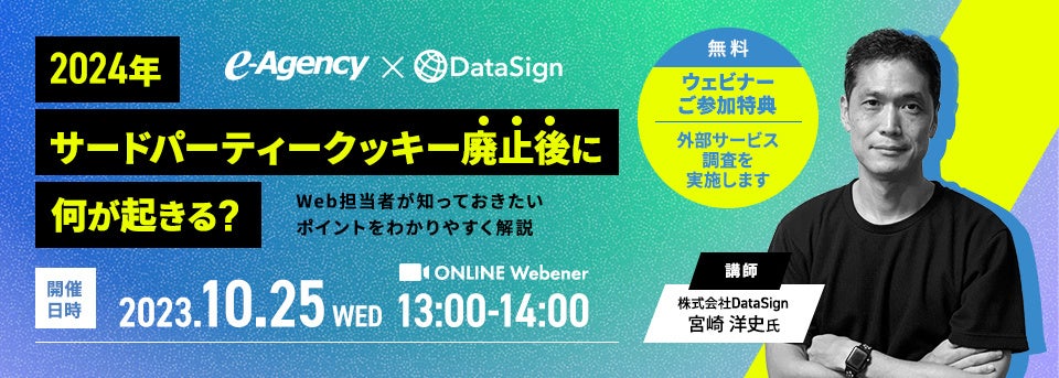 “おもてなしを科学する”株式会社イー・エージェンシー(本社:東京都千代田区、代表取締役:甲斐真樹)は、「2024年度のデータプライバシー対策」をテーマに、DataSign社 × イー・エージェンシー 共催ウェビナー「2024年 サードパーティークッキー廃止後に何が起きる? Web担当者が知っておきたいポイントをわかりやすく解説」を、10月25日(水)に開催いたします。