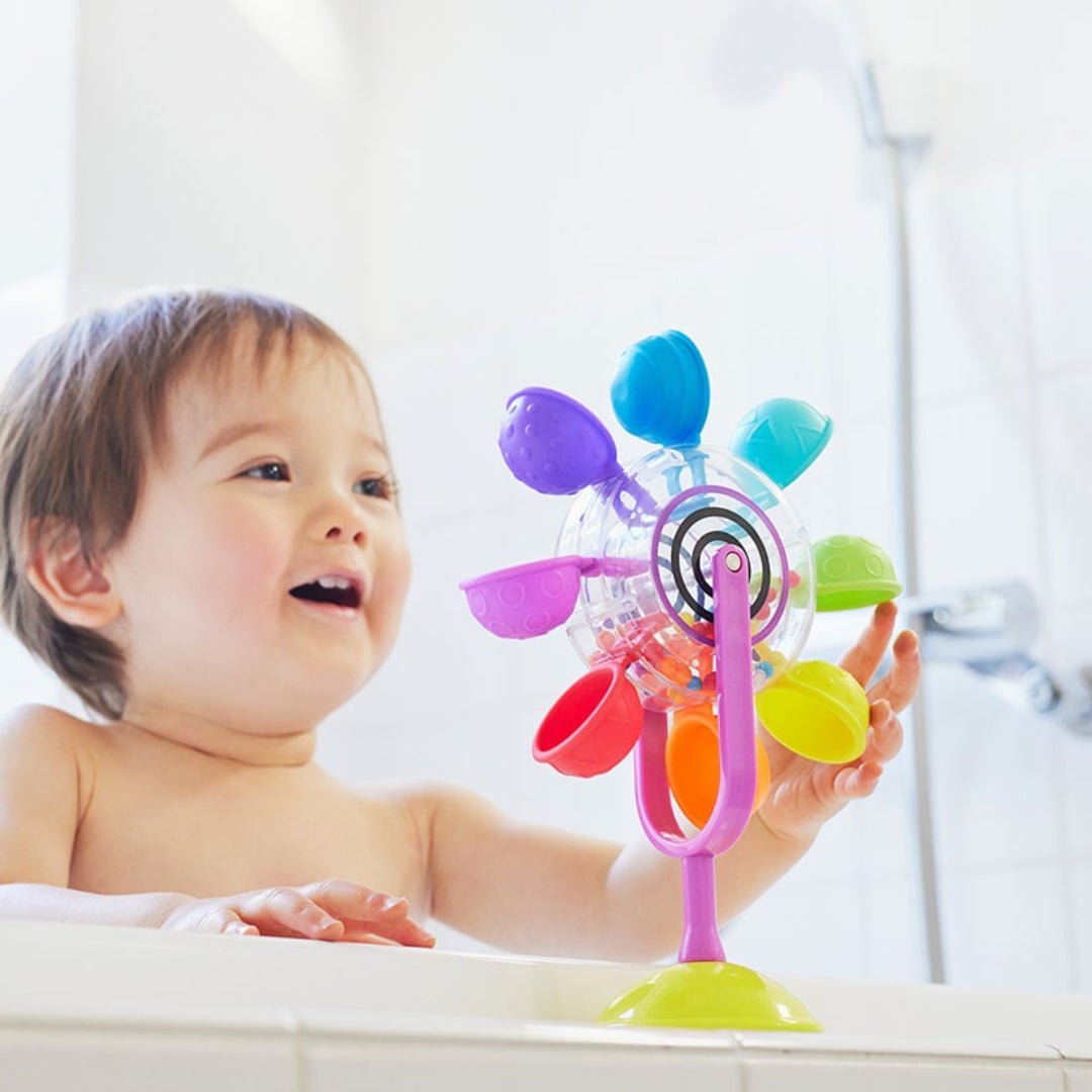 カップに水をかけるとクルクル回って虹のように見える水遊びおもちゃ。やわらかいシリコーンのちいさなカップは赤ちゃんの力でも簡単に回せます。カラフルなビーズのカラカラ音も夢中で遊びたくなるポイントです。