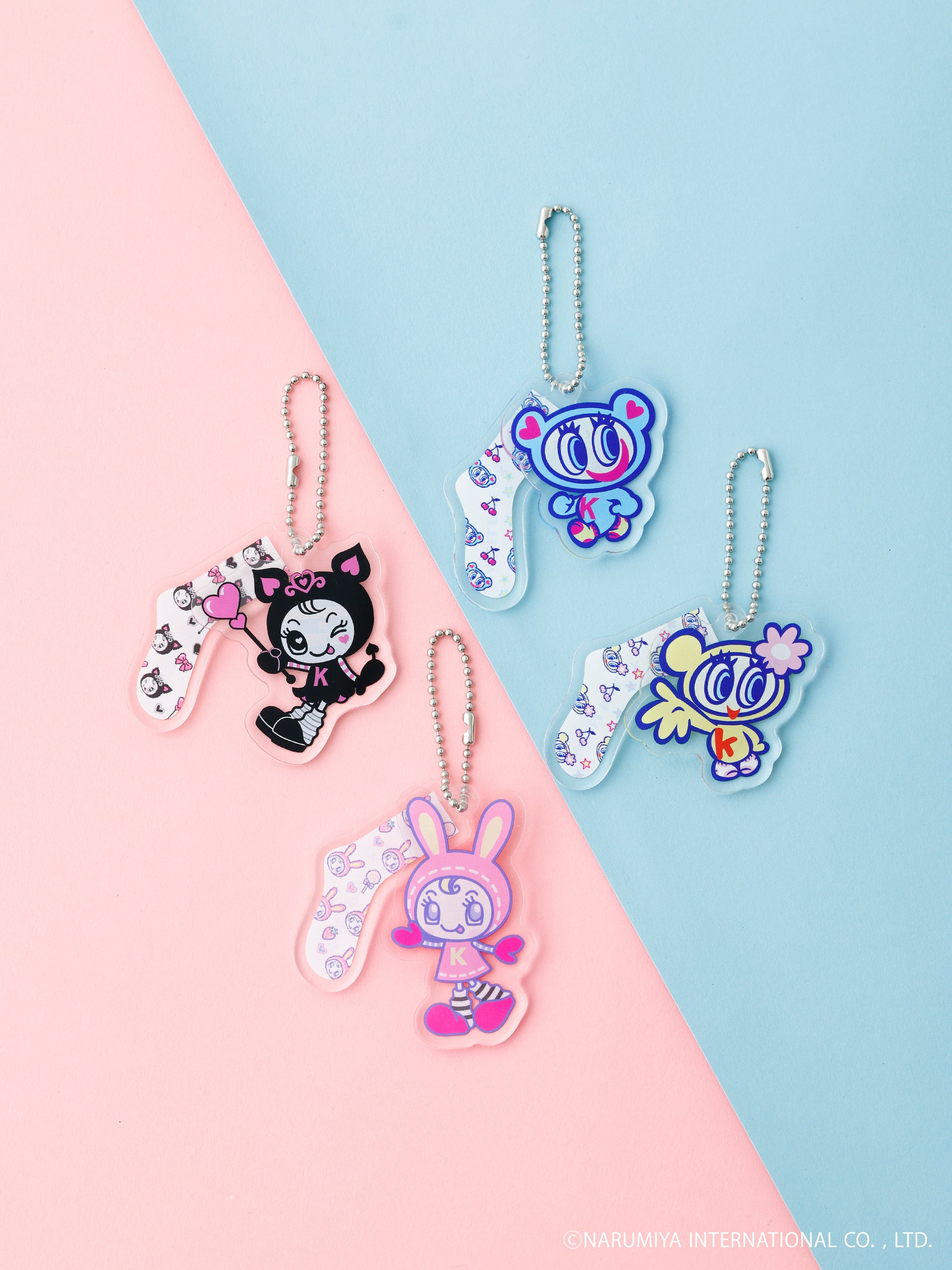※ノベルティがなくなり次第、キャンペーンは終了となります。あらかじめご了承ください。ノベルティは全4種類あり、ナカムラくん・ハナちゃん・ベリエちゃん・デビリーちゃんとそれぞれの総柄ソックスのミニチュアがセットになったアクリルキーホルダーです。キャラクターはランダムでの配布となります。