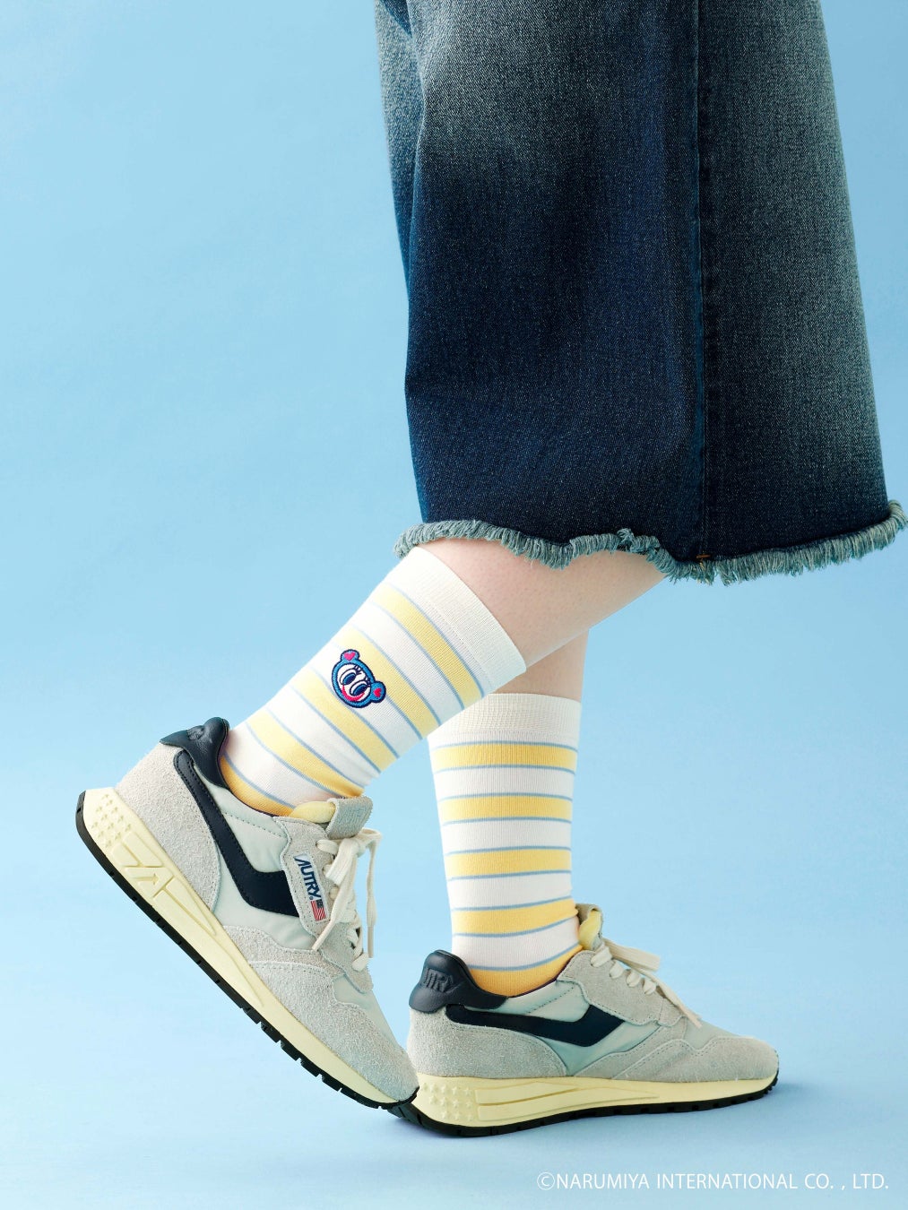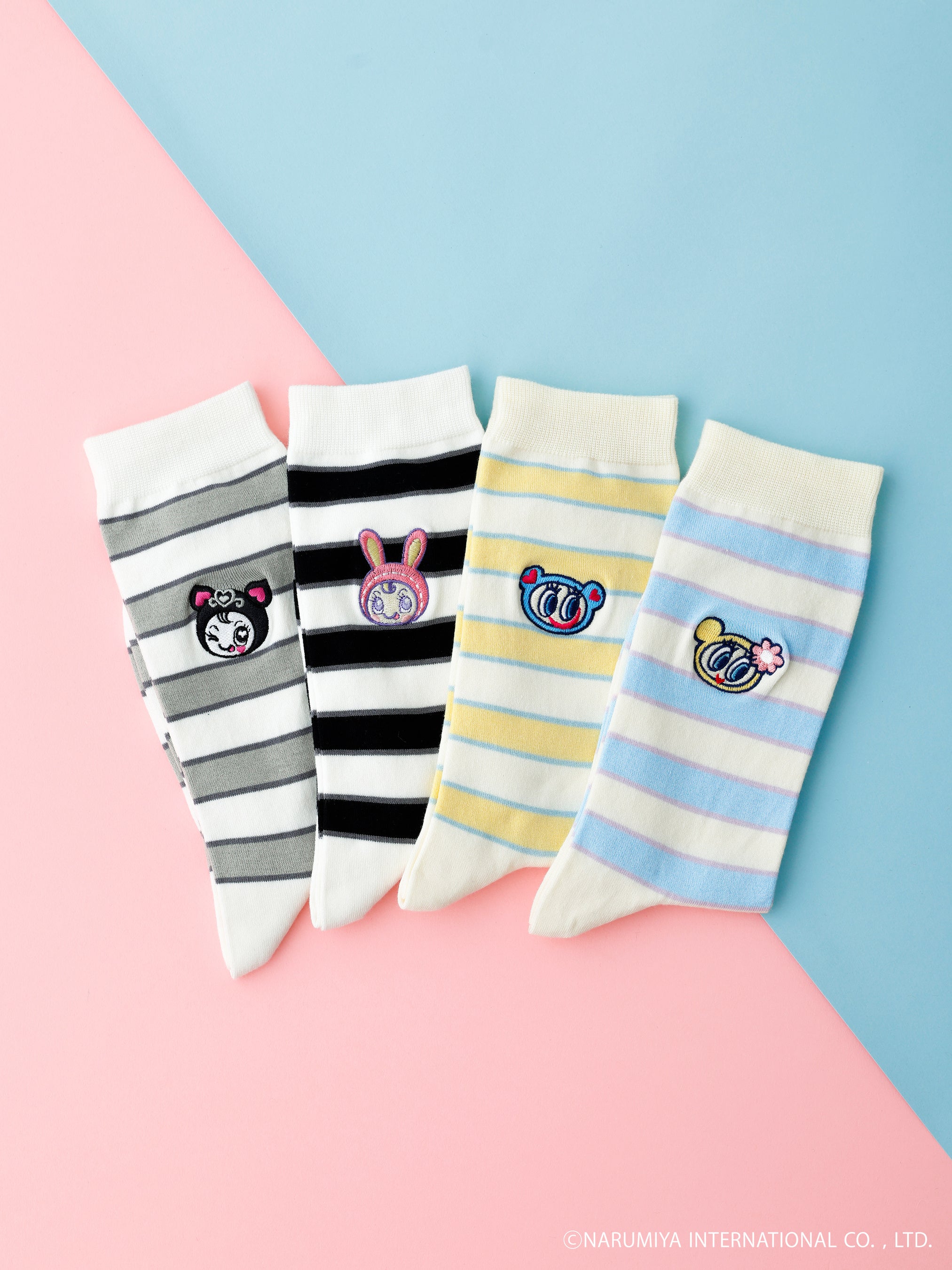 商品は、いずれもふくらはぎにかかるくらいのクルー丈です。ボーダーを基調とした「ボーダー刺繍スリークォーター」とキャラクターの顔の柄を商品全体にあしらった「総柄クルー」の2型、それぞれ4柄、合計8品番で展開します。サイズは22.5cm~24.5cmの1サイズです。
