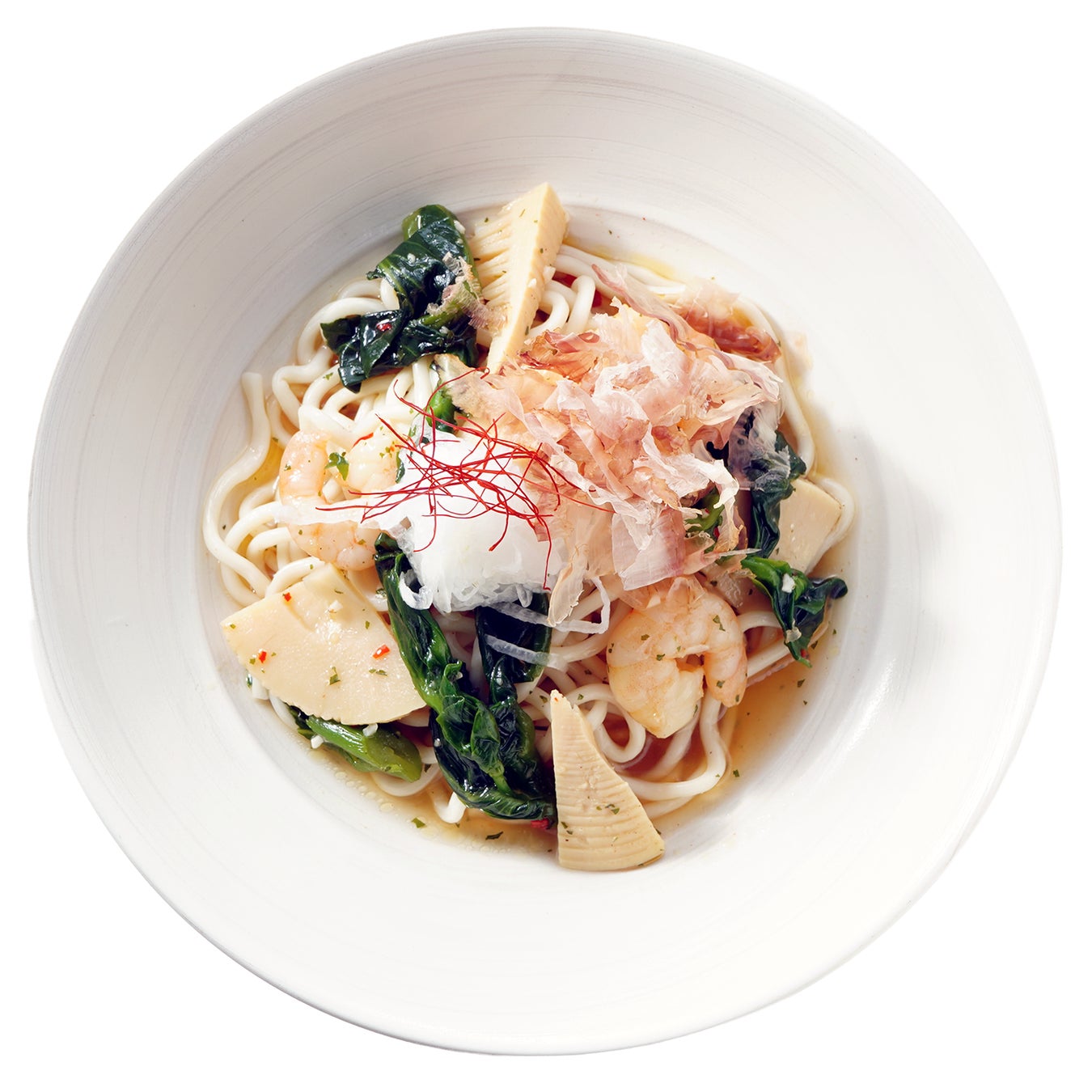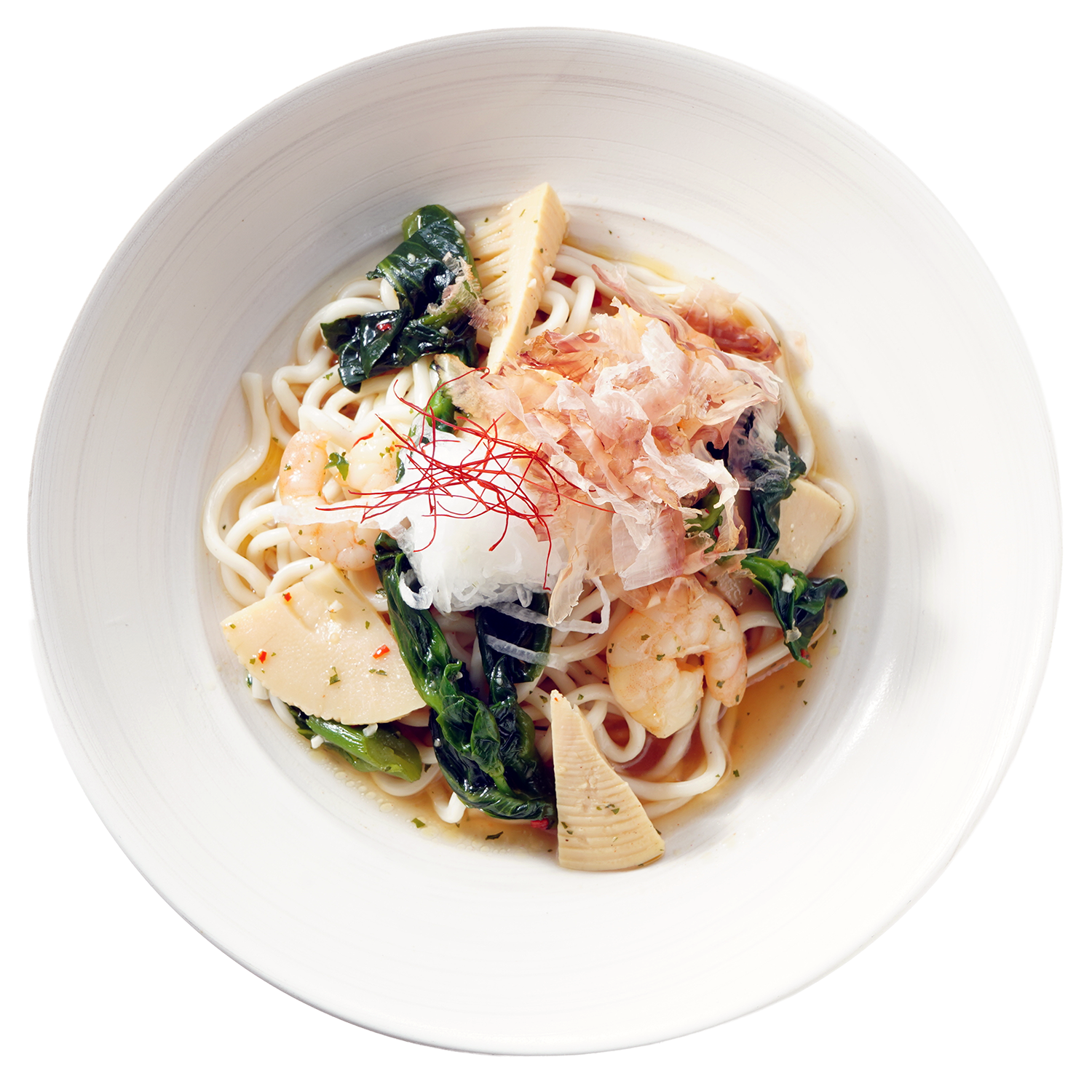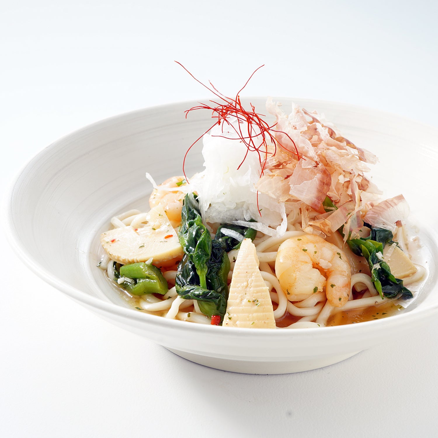 春の味覚であるタケノコと菜の花に、甘みの乗った新玉ねぎを合わせ、香ばしいにんにくと唐辛子で軽やかに仕上げた和風ペペロンチーノです。シャキッとしたタケノコの食感、菜の花のほろ苦さ、新玉ねぎのやさしい甘みが調和し、春ならではの香りが広がる一皿です。
