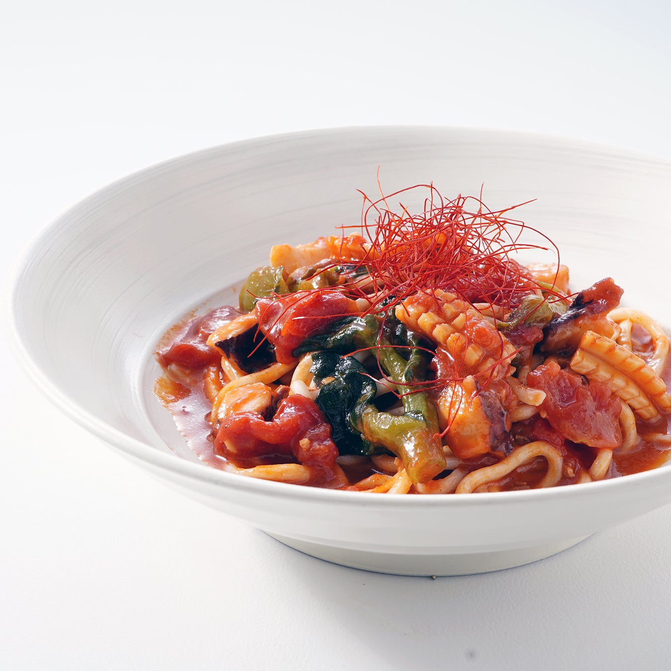 ぷりっとしたイカと旨味の濃いタコに、春を告げる菜の花を合わせ、にんにくと唐辛子で香り高く仕上げたガーリックチリパスタです。海鮮の旨味とオイルのコク、菜の花のほろ苦さが絶妙に重なり、春らしい軽さの中にしっかりとした満足感が広がる一皿です。