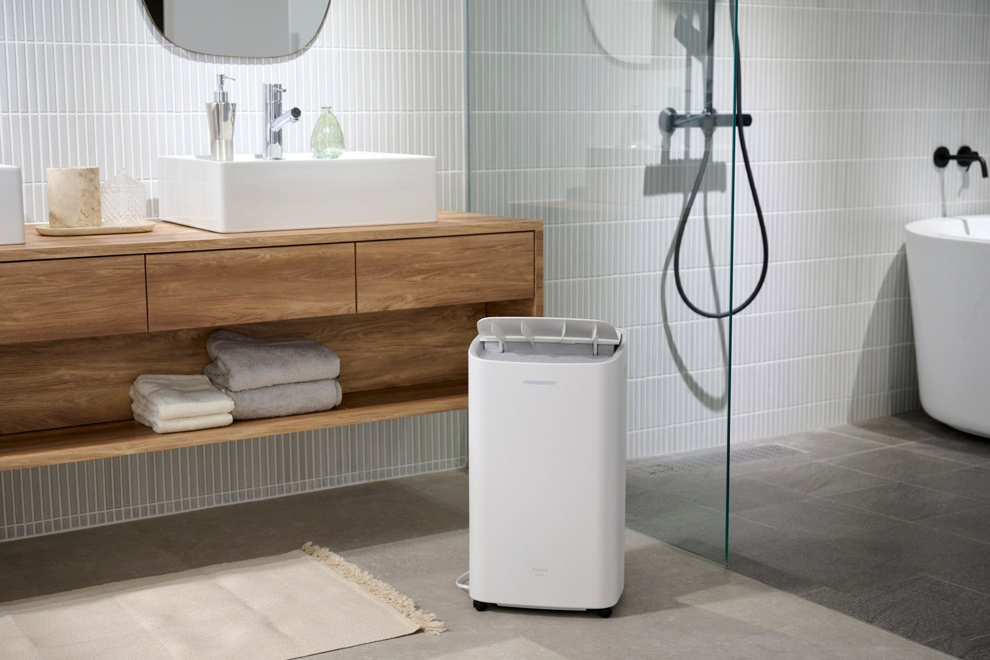 限られたスペースにも置きやすいコンパクトサイズながら、1日あたり約10L*1(電源周波数60Hzの地域において)の高い除湿量が特長。特に室温の高い時季にパワフルに除湿できるコンプレッサー式で、梅雨の時季のじめじめ解消や室内干しの生乾き臭対策などに役立ちます。木造13畳程度の広さに対応し、最低3℃~使用できるため、梅雨や夏に限らず、冬の結露対策などオールシーズン活躍する一台です。ほぼA4サイズの設置面積のため、一人暮らしのワンルームでも設置しやすく、クローゼットなどの限られたスペースに収納しやすいのも特長です。
