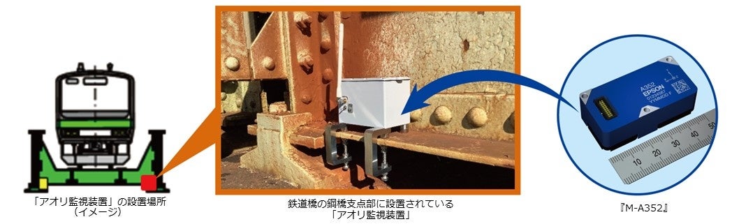 共同開発した「アオリ監視装置」は、アオリの大きさをエプソンの『M-A352』により自動で測定し、測定結果は信号処理を行い管理しやすいデータに加工の上、電子メールで送信します。これにより、遠隔でアオリの測定が可能となり、これまで作業員に頼っていた監視作業の自動化に貢献します。